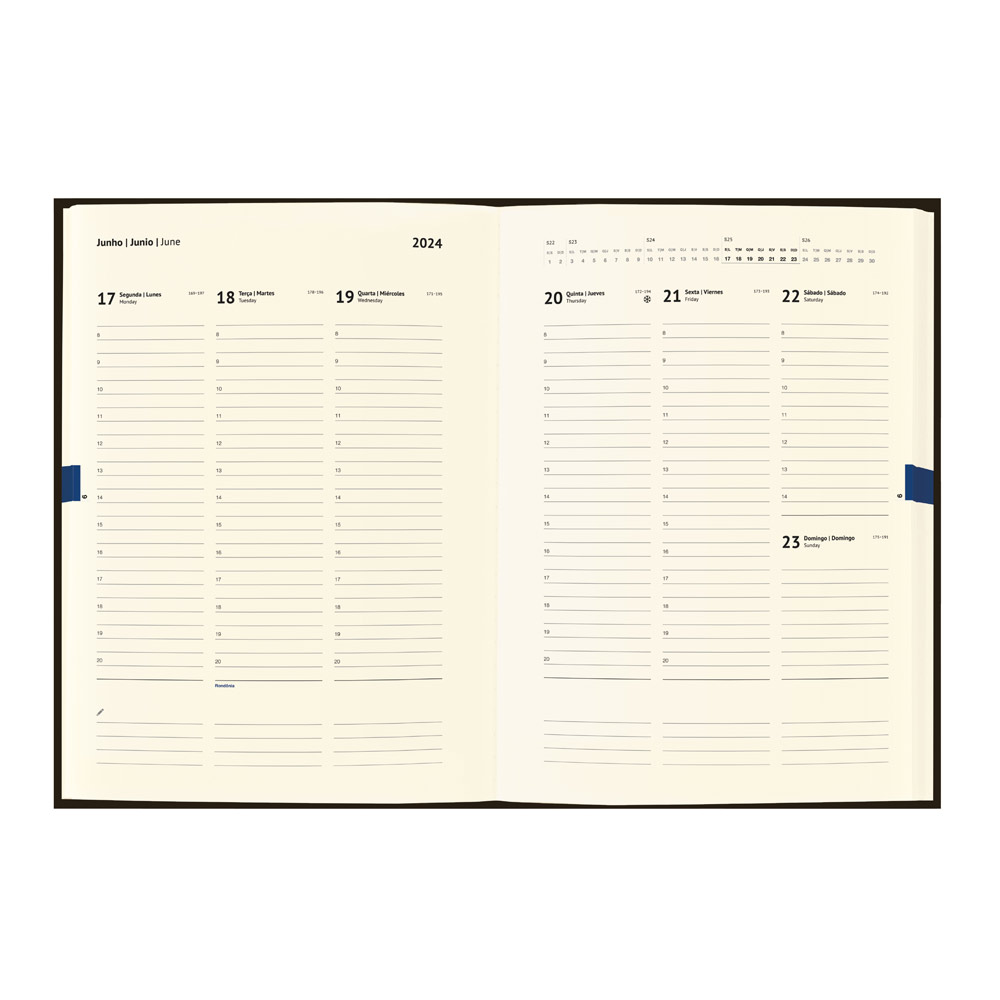 Agenda B5 em cortiça com suporte para esferográfica (não incluída) e marcador em fita. Está organizada num plano semanal. Fornecida com bolsa de non-woven.