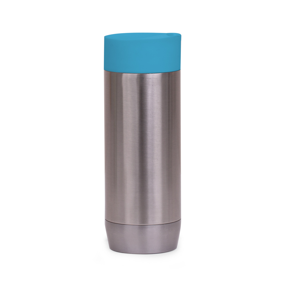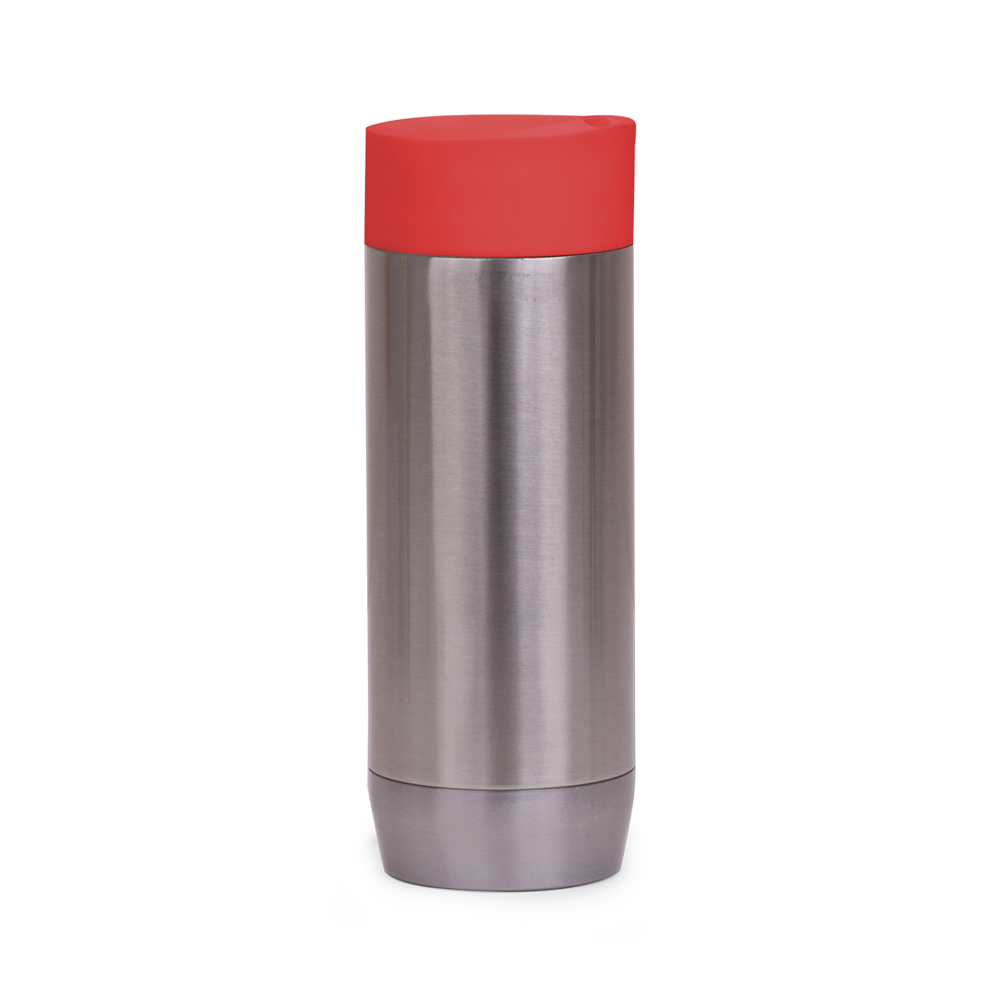 Caneca em aço inox com parede dupla isolada a vácuo com capacidade de até 450ml, conserva temperatura quente ou fria e tampa com vedação.