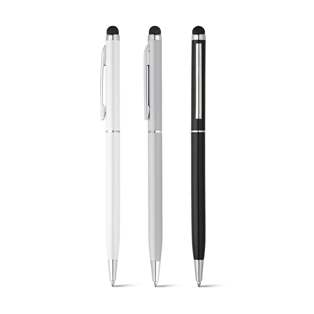 Esferográfica em alumínio com mecanismo twist, clipe e ponteira touch.