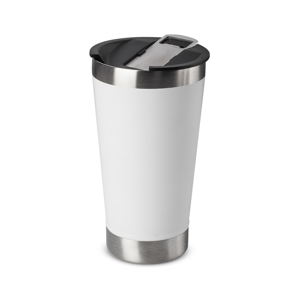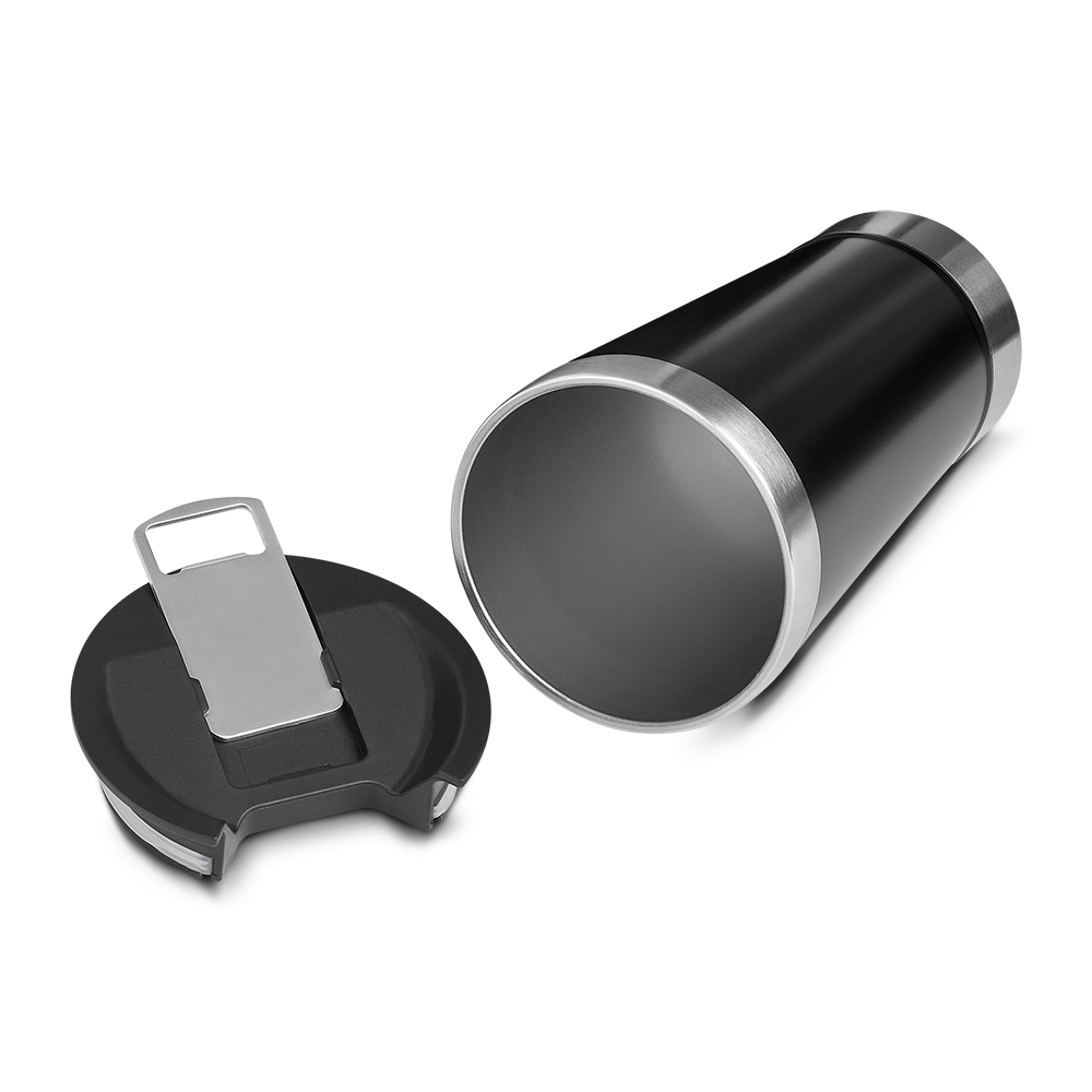 Copo térmico em aço inox com parede dupla, detalhe em aço escovado, tampa plástica com anel de silicone para vedação com abridor de garrafas em inox. Capacidade 500ml, pintura fosca.