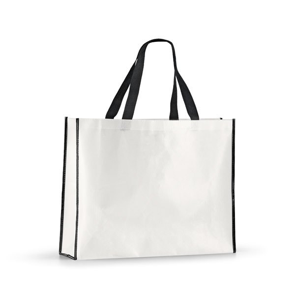 Sacola. Non-woven laminado: 120 g/m². Laminação brilhante. Alças em webbing de 60 cm.